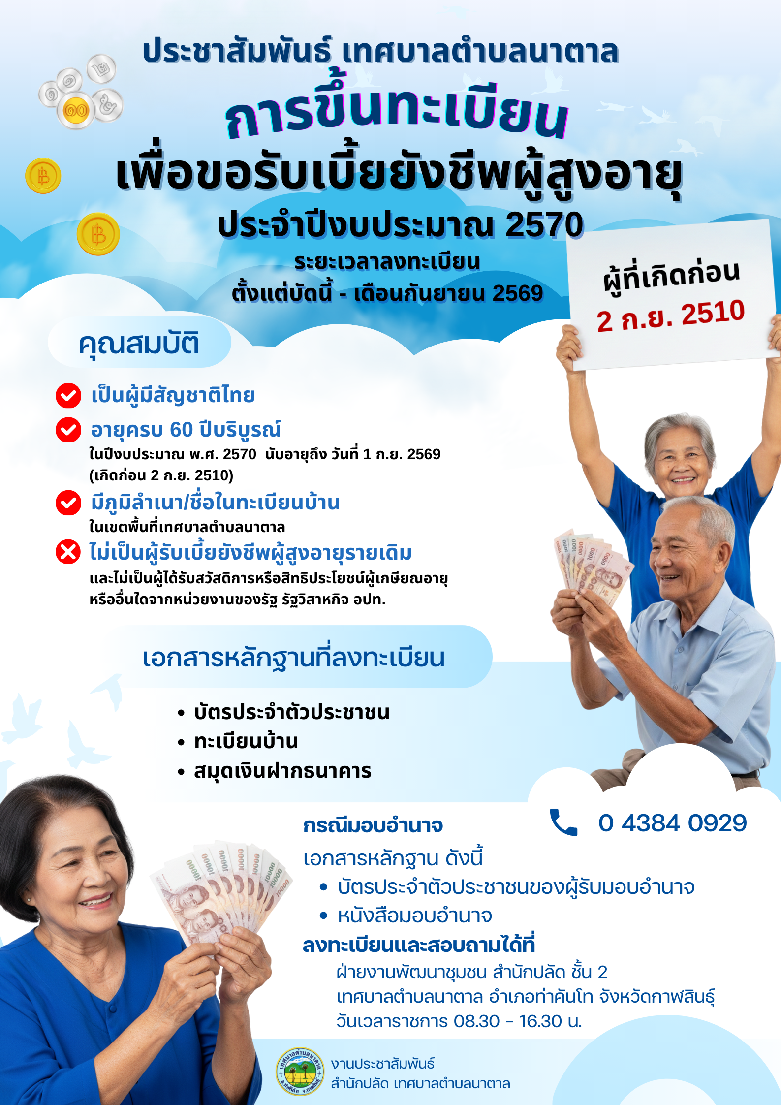 ประชาสัมพันธ์การทะเบียนรับเบี้ยยังชีพผู้สูงอายุ เพื่อรับเงินเบี้ยยังชีพประจำปีงบประมาณ 2570