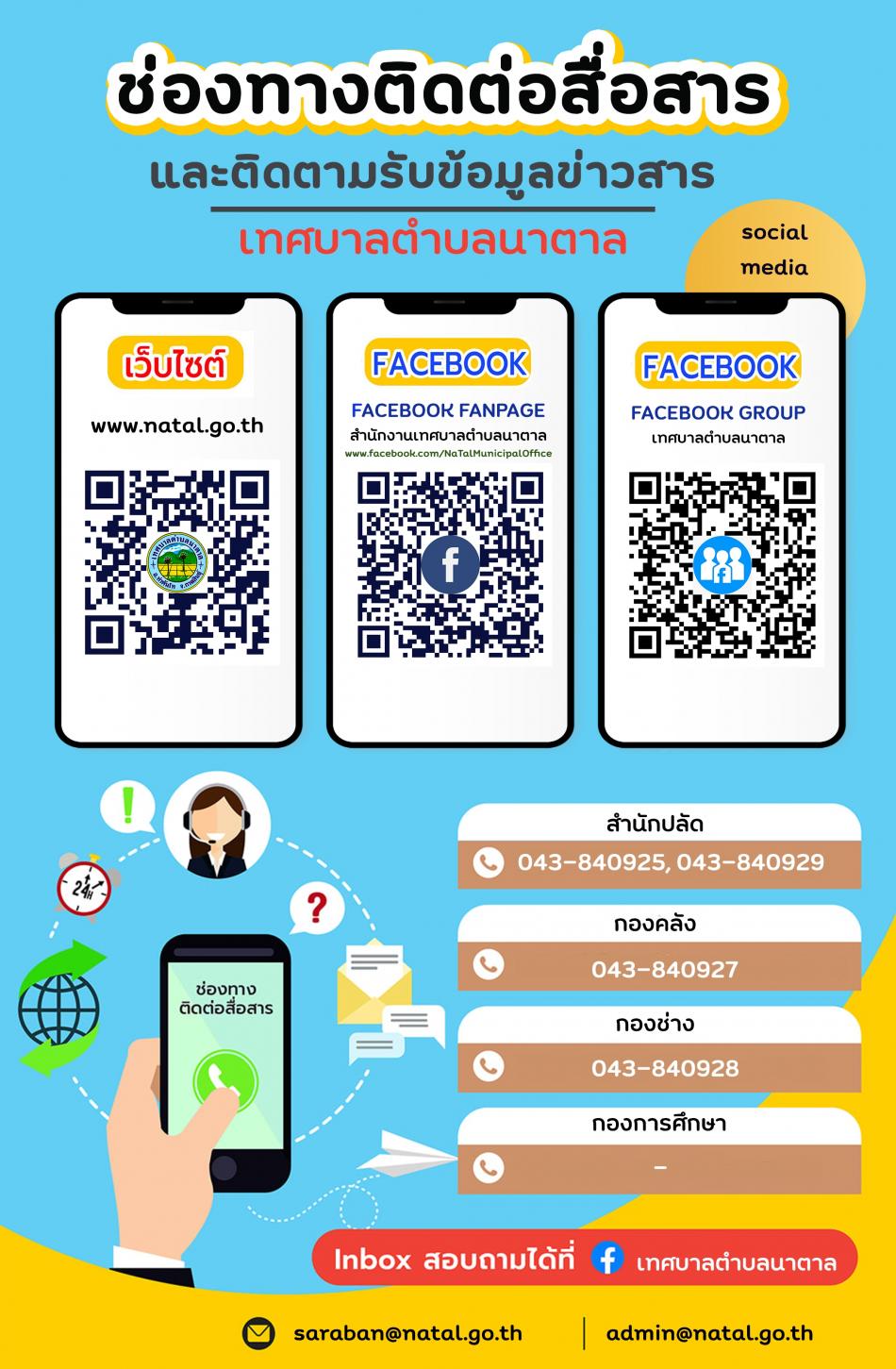 เทศบาลตำบลนาตาล หมู่ที่ 4 ตำบลนาตาล อำเภอท่าคันโท จังหวัดกาฬสินธ์ุ 46190 โทร. 043840925, 043840929 อีเมลล์ : admin@natal.go.th / saraban@natal.go.th